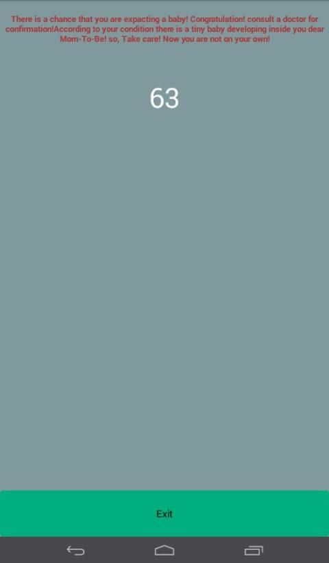 untuk memeriksa Kehamilan pada saat khusus ketika Anda di keadaan awal kehamilan sangat sulit. Aplikasi ini berisi parameter yang berbeda untuk memeriksa kehamilan. Pertama Anda harus harus hukum dalam usia untuk menjadi seorang ibu kedua Anda memiliki periode siklus menstruasi dan panjangnya