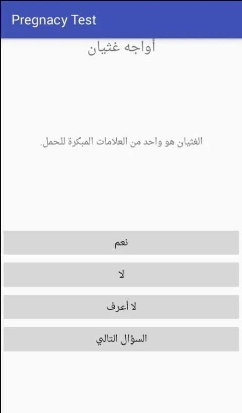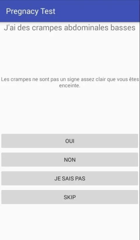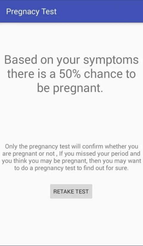 Menjawab beberapa pertanyaan dan menentukan apakah Anda sedang hamil atau tidak, pertanyaan-pertanyaan yang sangat akurat, Jika Anda berpikir Anda memiliki bayi Anda dapat mendownload aplikasi sederhana ini dan menjawab kuesioner.