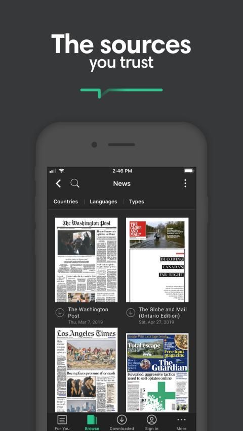 Membaca cerita-cerita surat kabar dan artikel majalah menit mereka sudah tersedia di newsstands. Bergeser dengan mudah antara replika halaman asli dan tata letak cerita kustom dioptimalkan untuk membaca mobile. Atau, membawa itu semua untuk hidup dengan modus mendengarkan, terjemahan satu sentuhan, dan dinamis komentar.