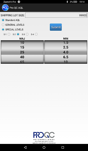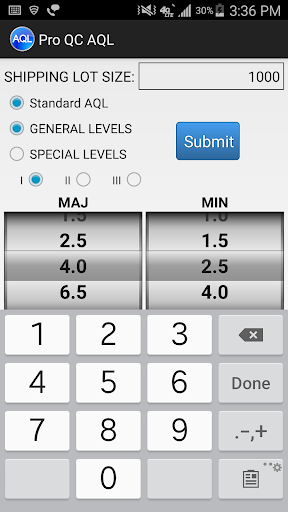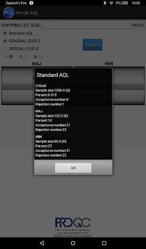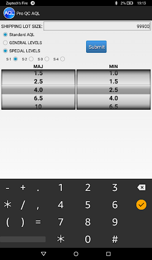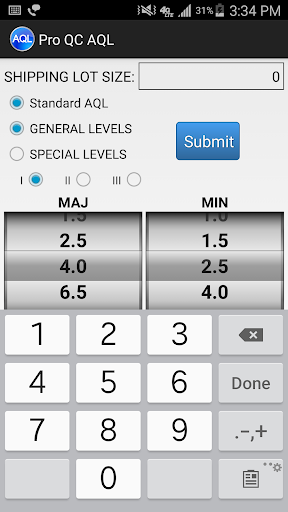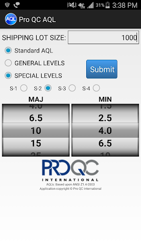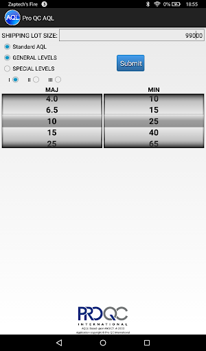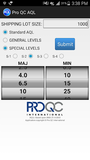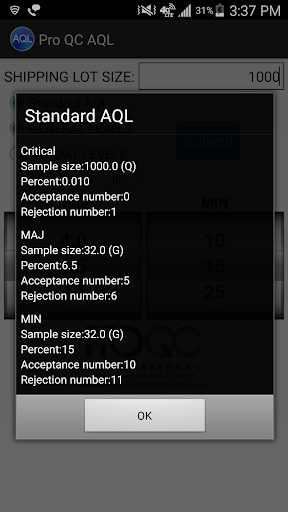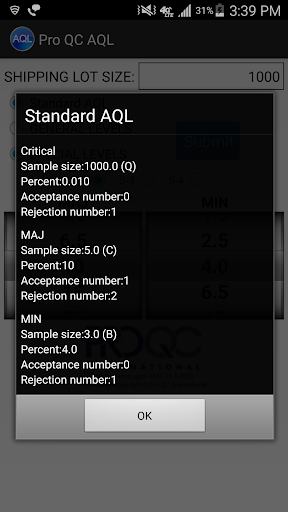 Kalkulator Pro QC AQL (Batas Kualitas Penerimaan) (berdasarkan berdasarkan ANSI Z1.4-2003) membuatnya mudah untuk menentukan ukuran sampel dan jumlah yang tepat dari penolakan yang diizinkan dalam ukuran lot pengiriman tertentu.