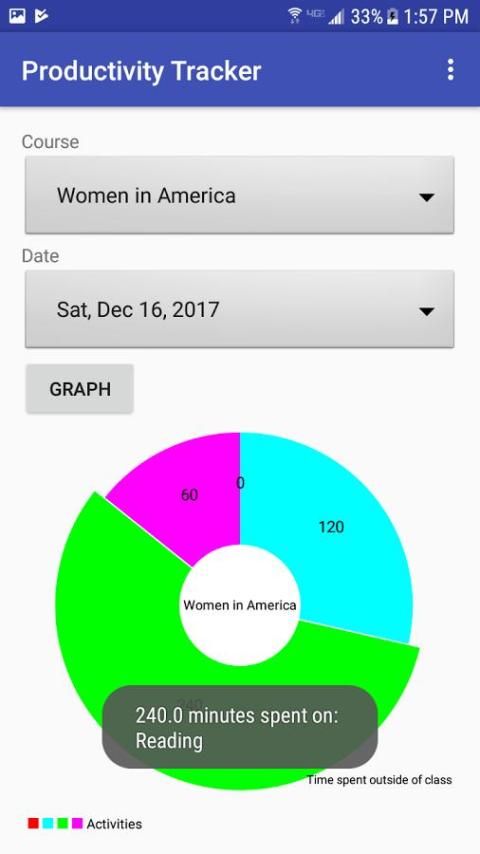 Ingin melihat di mana waktu Anda sudah dalam seminggu terakhir? Ingin membandingkan berapa banyak waktu Anda dihabiskan untuk satu kelas versus lain? Atau pada satu kegiatan untuk kelas versus lain? Aplikasi ini membantu Anda menjawab pertanyaan-pertanyaan. Produktivitas Tracker memungkinkan Anda untuk log waktu yang dihabiskan pada aktivitas untuk kursus dan kemudian memvisualisasikan data Anda pada pie chart. Fitur dari aplikasi ini meliputi: