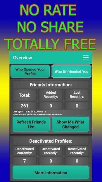 The app has two features - you can check who visited your profile and also who removed you from friends. Just log in to your facebook and that's it! Check all the information with couple of clicks!