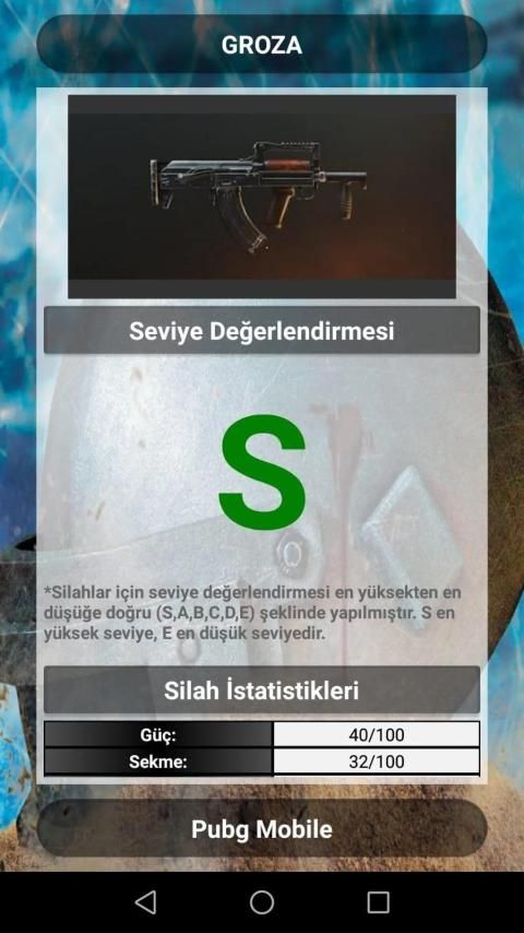 Pubg Mobile için challenge üretici ve rehber uygulaması. Pubg Mobile içindeki silahların hangi tipte mermi kullandıklarını, mermi başına verdikleri hasarı, menzillerini, ateş frekanslarını, hangi klasmanda olduklarını merak ediyorsanız bu uygulama tam size göre. Pubg Mobile oynamaya yeni başlayan arkadaşlarınız var ise onlara tavsiye edebileceğiniz, Pubg Mobile oynamaya yeni başlayan kişi siz iseniz sizin kullanabileceğiniz Pubg Mobile Rehber Uygulaması şimdi markette. Uygulamanın yapabildikleri bunlarla sınırlı değil. Bu oyunda usta olduğunuzu düşünüyorsanız ve bir meydan okuma peşindeyseniz rastgele challenge üretici bu uygulamanın içinde. Sadece Pubg Mobile değil, Pubg ve Pubg Lite için de oldukça faydalı bir uygulama. Silah eklentileri, hangi silahların hangi eklentilerle uyumlu oldukları, silahlar için en iyi eklenti paketleri bu uygulamada. Oyun içi silah sesleri de artık sizinle. Bu uygulama çorba paranızı çıkartmanızda size yardımcı olacak. Hepinize iyi oyunlar!