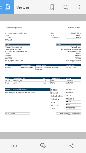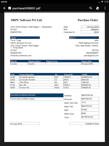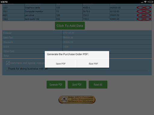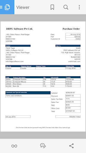 Feature to review PDF File of Purchase Order within the App before you email or share it.