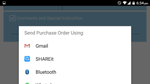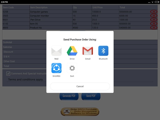 Anda dapat menyimpan PDF pesanan pembelian yang dihasilkan ke penyimpanan seluler Anda atau dapat mengirim cetakan email atau berbagi menggunakan aplikasi favorit Anda.