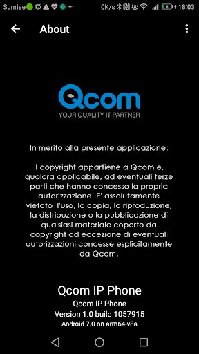 "QCOM IP-Phone" adalah ponsel lunak berbasis telepon Internet yang memungkinkan Anda menerima dan melakukan panggilan pada ponsel cerdas Anda. Koneksi dibuat ke sistem switching hosted yang didedikasikan dari QCOM. Aplikasi ini memungkinkan panggilan VoIP dan jaringan dan dukungan WiFiBerbagai jenis codec.