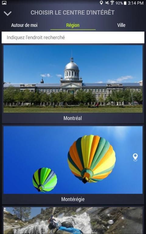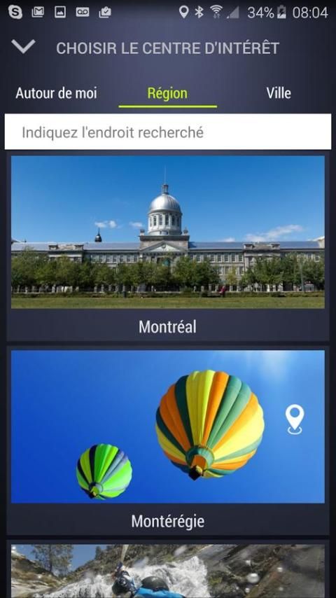 Sélecteur de région, ville et "Autour de moi" pour trouver rapidement un attrait