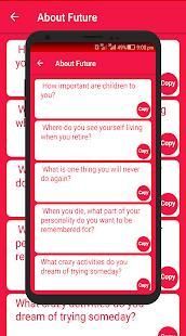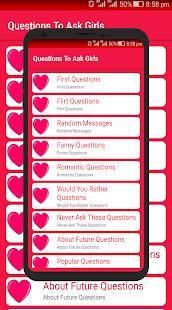 Build confidence and Get started with your crush with these ready questions carefully drafted into categories. We will guide you from the first date on various questions to ask to know her better, we also list some questions that are forbidden to ask. We pimp your conversation with funny and random questions. AS you progress, we have tones of love and romantic questions at your disposal. About future questions will help you understand her perceptions and her visions in life. What she values most. Try this app for free