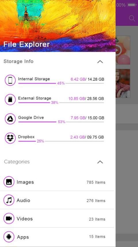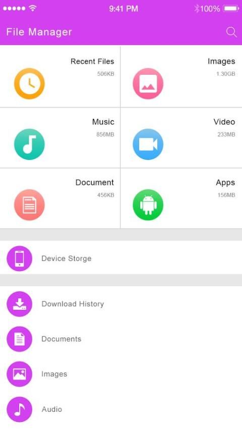 Cepat File Manager File Manager memungkinkan Anda untuk menyalin, memindahkan, mengubah nama, menghapus atau berbagi file ke dan dari setiap penyimpanan Anda. Hal ini juga memungkinkan Anda mencari dan mengakses file Anda berdasarkan kategori.