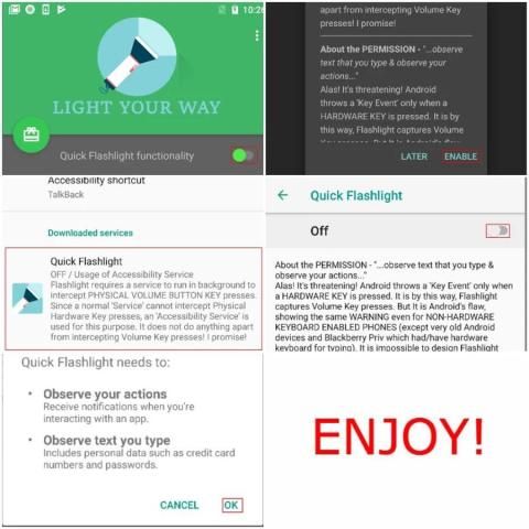 Sayang! Ini mengancam bukan? Senter cepat perlu izin untuk mendengarkan hardware fisik Anda (volume Tombol) Key menekan saja.