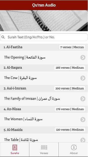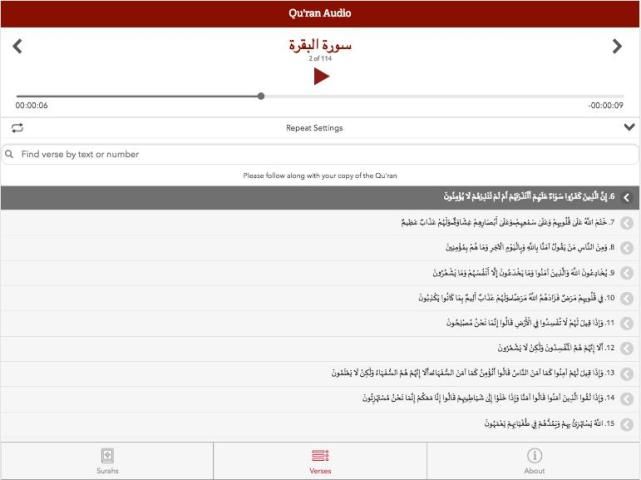 Qur'an Audio adalah aplikasi media audio yang dirancang untuk memberikan pengalaman yang optimal dengan bermain pembacaan audio setiap ayat dari Al-Qur'an dengan browsing dengan Surah / Bab atau mencari teks ayat. Hal ini dirancang untuk digunakan sebagai sumber daya membalik ketika mempelajari pengucapan bahasa Arab Al-Qur'an (Tajwid) dengan seorang guru. Siswa dapat mengatur berbagai ayat diulang secara otomatis untuk membantu dengan menghafal dan praktek ayat-ayat yang ditugaskan sebagai pekerjaan rumah. Mahasiswa itu kemudian mengikuti bersama dengan salinan dari Al-Qur'an, daripada membaca secara digital, sebagai berikut sepanjang dari bahan cetak diakui menjadi lebih baik untuk mengingat dan ulasan. Audio bacaan adalah dengan Mohamed Siddiq El-Minshawi, diakui untuk Tajwid sempurna nya.