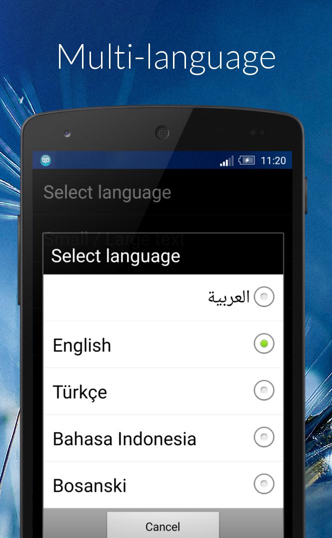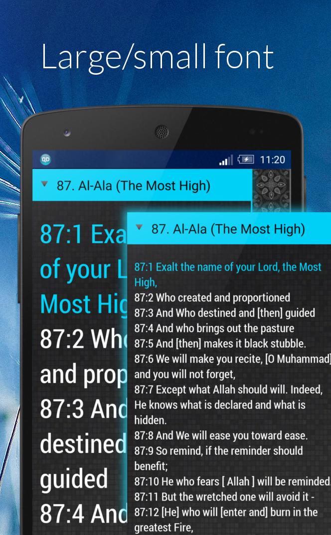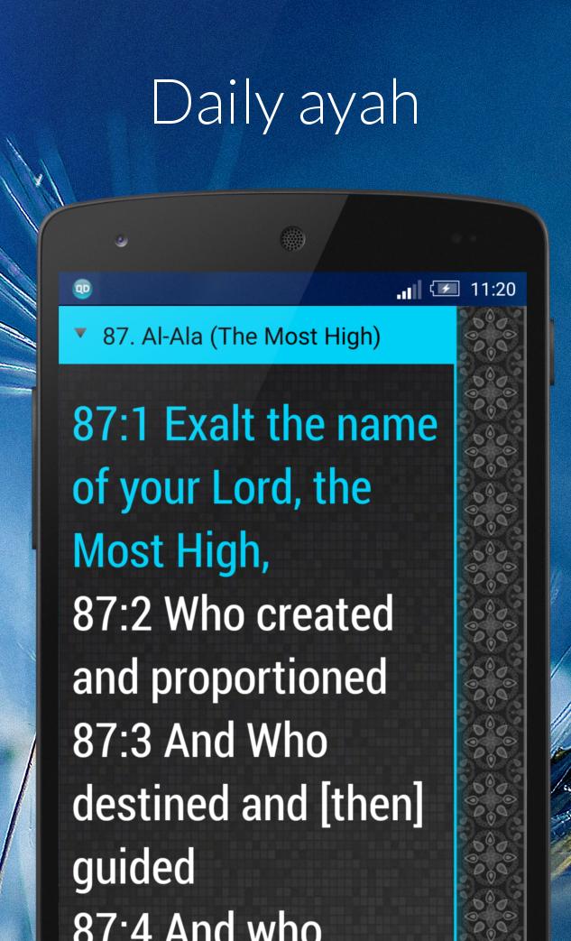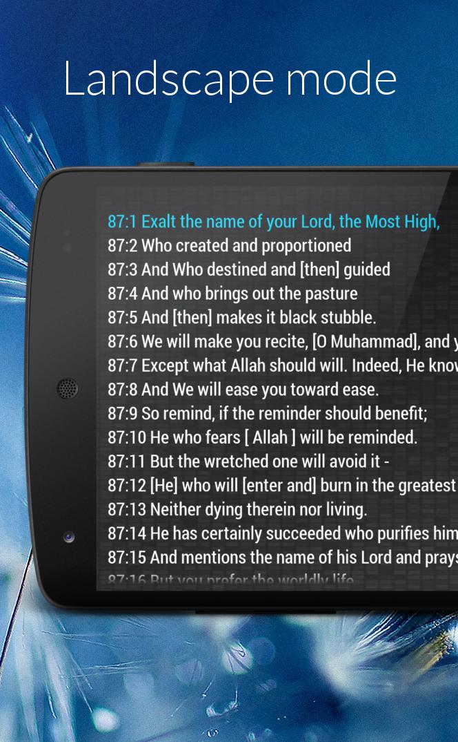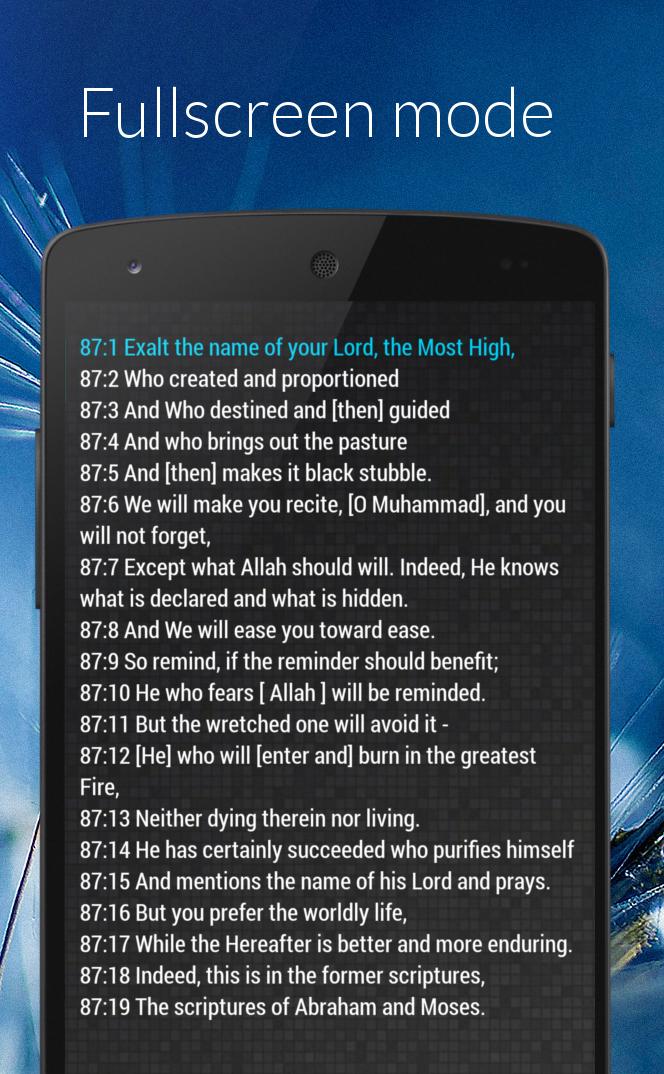 - Daily ayah reminder - Complete Noble Qur'an - Languages: العربية, English, Türkçe, Bahasa Indonesia, Bosanski - Easy to use - Large text size option - Day or night color theme - Fullscreen mode - Works offline