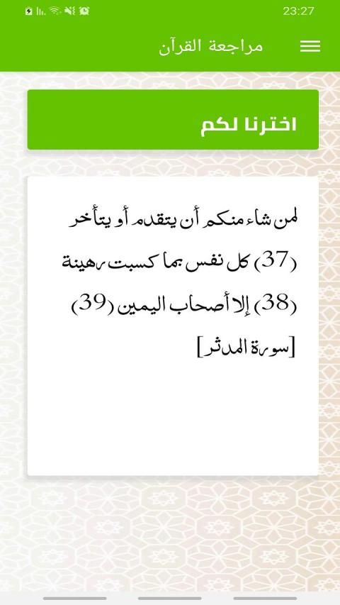 1.3.1 مراجعة شاملة بشكل عشوائي: نفس الأمر يتكرر لكن هذه المرة يتم اختيار آية من القرآن كاملا وتتغير بشكل عشوائي.
