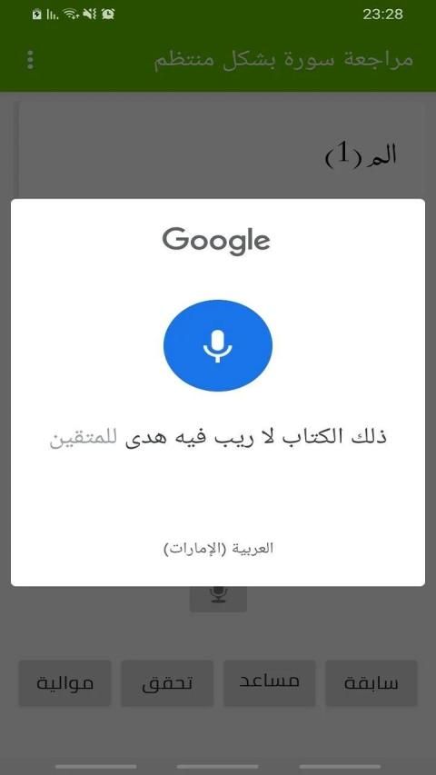 1.1.1 مراجعة السورة بشكل منتظم: فكرة الاختبار أنه وبعد اختيارك للسورة التي تريد مراجعتها يعطيك أول آية من السورة والمطلوب منك معرفة الآية الموالية لها إما عن طريق كتابتها أو تلاوتها، يقوم التطبيق بالتحقق من اجابتك ليخبرك ما إذا كانت صحيحة أم خاطئة، كما يمكنك الانتقال إلى آية محددة عن طريق اختيار "الانتقال إلى آية"، وكما يشير موضوع الاختبار فإن التنقل بين الآيات يكون بشكل منتظم من الآية إلى التي بعدها. وستجد في الأسفل زر الانتقال للآية السابقة أو الموالية، بالاضافة إلى زر المساعدة الذي يعطيك مقتطفا من بداية الآية التي أنت مطلوب بمعرفتها.