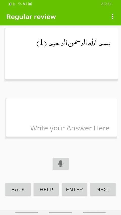 1.1.1 Tinjauan berkala dari surah: Gagasan dari tes ini adalah bahwa setelah Anda memilih surah yang ingin Anda tinjau, itu memberi Anda ayat pertama dari surah dan Anda diharuskan untuk mengetahui ayat yang setia kepadanya baik dengan menulisnya atau membacanya, aplikasi memeriksa jawaban Anda untuk mengatakan apakah itu benar atau salah, seperti yang Anda bisa lakukan. Pindah ke ayat tertentu dengan memilih "pindah ke satu ayat", dan seperti yang ditunjukkan subjek tes, transisi antara ayat secara teratur dari satu ayat ke yang berikutnya. Di bawah ini Anda akan menemukan tombol lompat untuk ayat sebelumnya atau berikutnya, serta tombol bantuan yang memberi Anda kutipan dari awal ayat yang harus Anda ketahui.