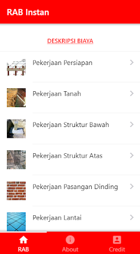 RAB Instan merupakan sebuah aplikasi untuk menghitung estimasi RAB yang didasari oleh estimasi biaya per pekerjaan yang dilakukan. Dalam aplikasi ini user dapat menghitung estimasi RAB secara instan dengan memasukkan volume dari masing-masing pekerjaan. Apabila harga yang tertera tidak sesuai, user dapat mengganti dan menyesuaikan sendiri harga yang diinginkan.