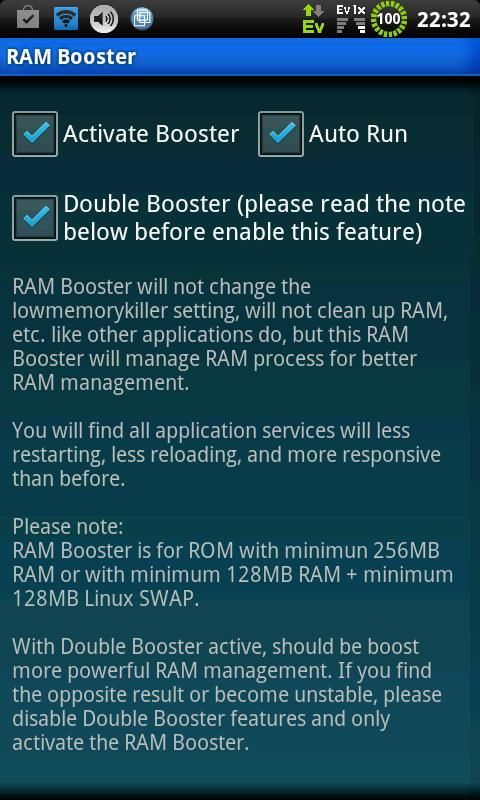 Unlike other simillar applications do, this RAM Booster will not change the lowmemorykiller setting, will not clean up RAM, etc. but this RAM Booster will manage RAM process for better RAM management.