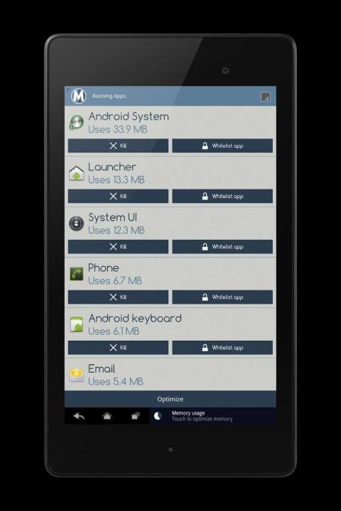 MEMbo kills those memory hogs and makes your Android usage smooth and fast again. Don't wait for those nasty "out of memory" warnings and "app not responding" popups. Stop them with a single tap and take back the control of your device's memory.