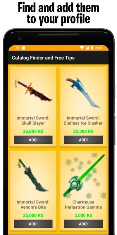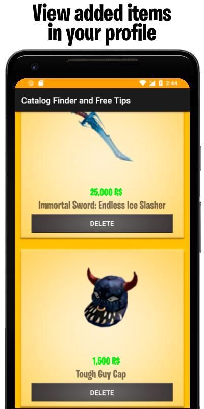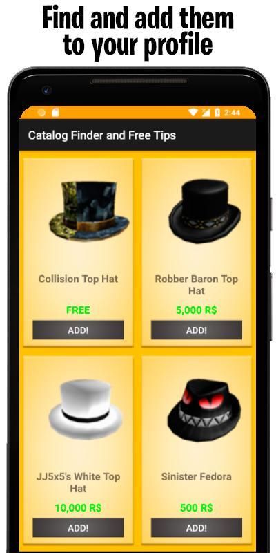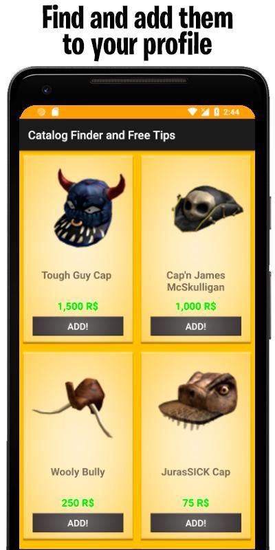 RBX Catalog Items Finder memungkinkan Anda untuk mengumpulkan barang-barang favorit Anda dan membelinya dari platform resmi. Ini memungkinkan Anda untuk menyimpan objek favorit Anda tanpa Robux, jadi ketika Anda menghasilkan koin di aplikasi resmi, Anda akan dapat membelinya dan dapat diakses semuanya.