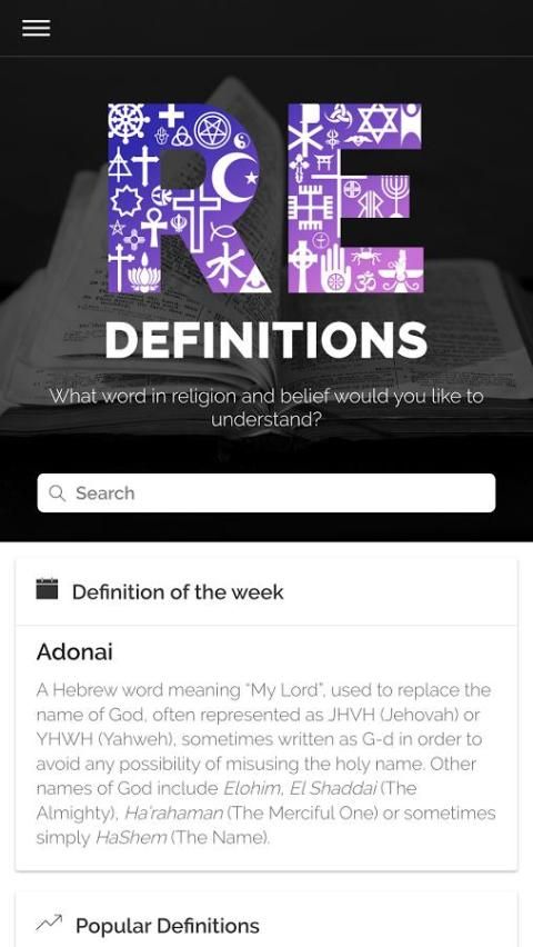 RE-Definisi memungkinkan guru RE untuk mencari pengucapan dan makna lebih dari 200 istilah kunci. Ini untuk non-spesialis yang ingin memahami kata-kata dan bagaimana mengucapkan mereka dengan percaya diri, dan untuk spesialis yang ingin memoles pengetahuan mereka. Dalam kedua audio dan teks, RE-Definisi menyediakan akurat, jelas, definisi sumber daya terkait istilah kunci dalam tujuh agama dan keyakinan, etika dan filsafat dan dalam studi agama dan keyakinan.
