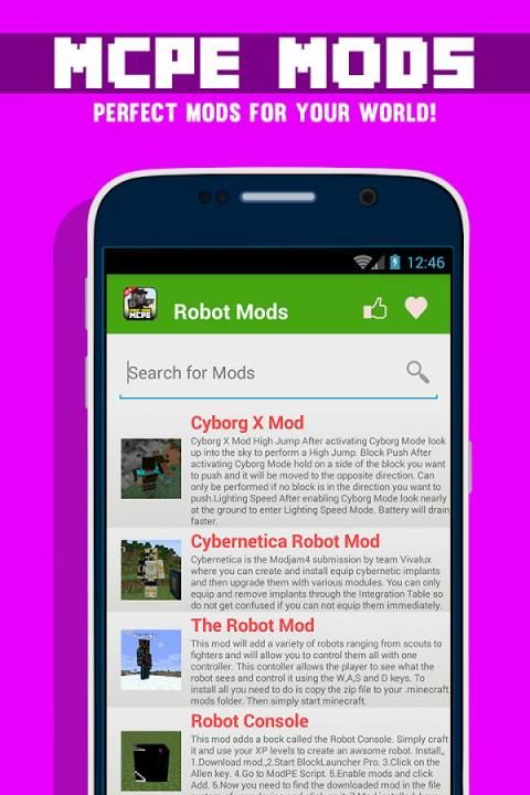 Setiap mod memiliki judul, deskripsi, screenshot dan tombol download. Cari setiap mods untuk mcpe Anda ingin hanya isi favorit mod dan tekan DOWNLOAD ... Selesai!