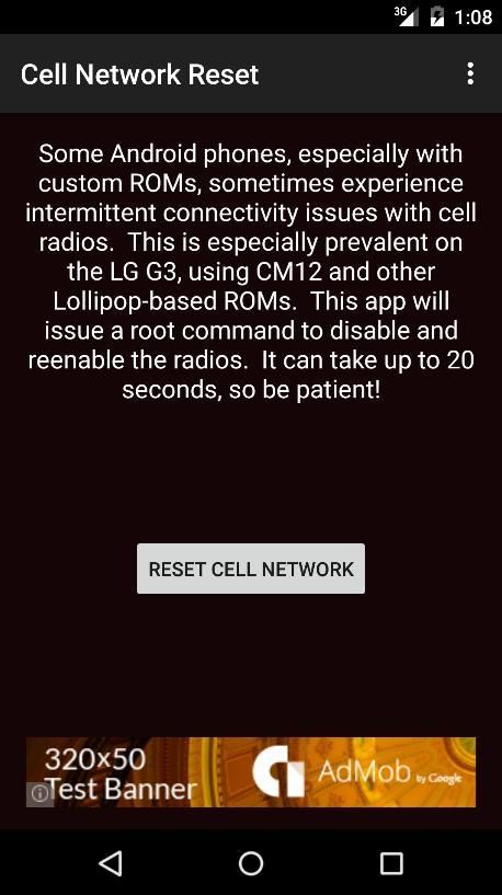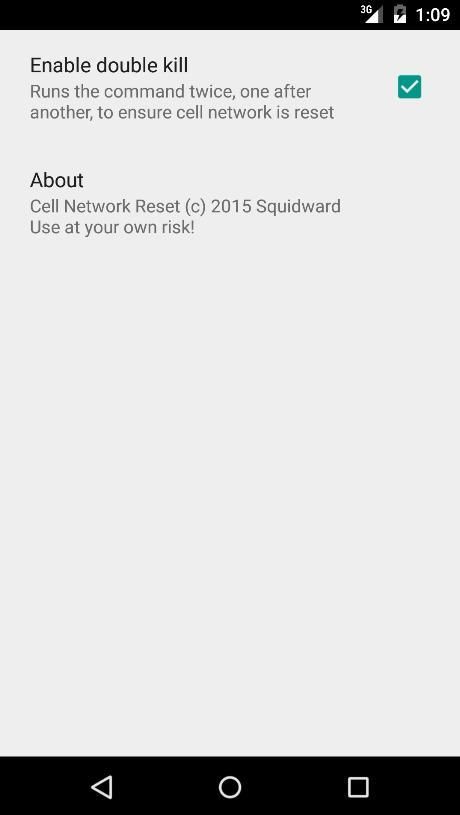 Beberapa ROM terkenal karena memiliki kehilangan sinyal selular, terutama LG G3 dengan CM12 dan ROM 5.x lainnya. Solusi yang selalu mengeluarkan `killall rild` di terminal, namun aplikasi ini sekarang melakukannya untuk Anda dengan menekan tombol.