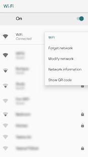 Dengan xposed, cara pintas untuk menampilkan info jaringan dan membuat kode QR ditambahkan tepat di pengaturan sistem wifi. Ketika diluncurkan dari pengaturan sistem, informasi jaringan yang lebih dapat ditampilkan, seperti jika itu metered², disimpan, atau terhubung.