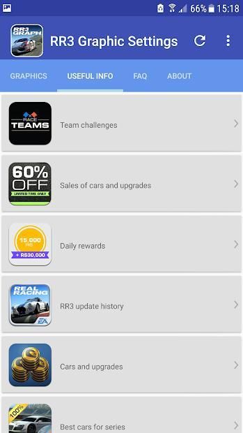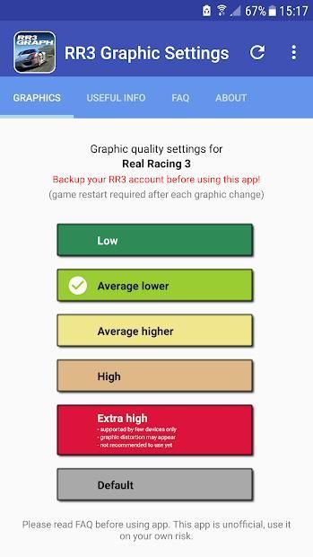 If you feel lag in Real Racing 3 game during racing, it means your default graphic settings are chosen incorrectly. With our app you can lower the graphics and enjoy smooth racing. 100% legal and safe, no device's root required, made for official RR3 versions only. Try and feel the difference!