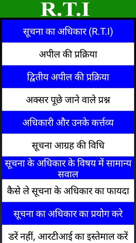 सूचना का अधिकार (R.T.I),अपील की प्रक्रिया,द्वितीय अपील की प्रक्रिया", "अक्सर पूछे जाने वाले प्रश्न,अधिकारी और उनके कर्त्तव्य", "सूचना आग्रह की विधि,सूचना के अधिकार के विषय में सामान्य सवाल,कैसे ले सूचना के अधिकार का फायदा,सूचना का अधिकार का प्रयोग करे,डरें नहीं, आरटीआई का इस्तेमाल करें,सूचना का अधिकार समस्यायें व समाधान,सूचना के अधिकार के तहत कुछ सैम्पल आवेदन,ग्रामीण समस्याओं से सम्बंधित आवेदन,आरटीआई की कठिन लड़ाई,सूचना का अधिकार विधेयक, 2005,राज्य सूचना आयोग,प्रकीर्ण,आम लोगों के लिए सूचना का अधिकार,सूचना अधिकार कानून का प्रभावी कार्यान्वयन,RTI Act (India) & State Rules,RTI - Right to Information Act,rti india app,rti act in india free apps in hindi,rti act 2005 in hindi,online rti hindi english,rti application form,R.T.I ke Bareme Jaaniye,rti book in hindi,right to information act 2005 in hindi,right to education act 2009 in hindi,RTI - सूचना का अधिकार In Hindi,suchna ka adhikar in hindi,Bhartiya Samvidhan GK in Hindi,Constitution of India MCQ for NEET 2018 offline,Bharat ka Sanvidhan Study Guides,Bharat ka Sanvidhan Question and Answer in Hindi,General Knowledge,Constitution of India Quiz,Bharat ka Sanvidhan Text Book,Bharat ka Sanvidhan Study App,Bharat ka Sanvidhan Apps in Hindi,Bhartiya Samvidhan Objective Question,Oneliner GK,Constitution of India Notes in Hindi,Constitution of India Offline Question Bank,Constitution of India in Hindi App,Bhartiya Kanooni Dhara in Hindi 2018,Kanoon ki Puri Jankari,Indian Laws and Acts in Hindi,IPC in Hindi (Indian Penal Code in Hindi Full),Indian Law Books,Constitution of India MCQ,Constitution of India Notes,Constitution of India Quiz,Bharat ka sanvidhan in hindi,amendment of constitution india in hindi,schedule of crpc,criminal procedure code 1973 in hindi,Indian Law Section,Indian Penal code (IPC),Child Marriage Act 2006,Right to Information Act 2005 (RTI),Indian Constitution in Hindi offline,Criminal Law India in Hindi,Land Mutation Law,Hindu Marriage Act 1955 and Special Marriage Act 1954,Divorce Act 1869,Husband Wife Rights in Hindi,Hindu Adoption and Maintenance Act 1956,Guardian and Wards Act,Family Law Bare Act,Family Court Act 1984,Woman Laws in Hindi,Defamation laws,Consumer Protection Act 1986,Legal Rights for Doctors, Students and Teachers,Railway Law in Hindi,GST 2018 कायदा,RTO कायदे,Bhartiya Dand Sanhita 1860 in Hindi (IPC in Hindi),Traffic Rules and Penalty in Hindi,Maharashtra Land Revenue Code 1966 in Hindi,Gram Panchayat App Hindi ( Information related to Gram Panchayat laws of Maharashtra),Co Operative Housing Society Laws Hindi,Human Rights Law in India in Hindi,Sirf Mahilao ke liye Kanoon (Women Rights in India),Kayda in Hindi,Hindi Law Apps,GST app in Hindi,Satbara Utara Maharashtra (7 12 Utara),Kamgar Kayda Hindi,RTI Act 2005 in Hindi (Mahiticha Adhikar Hindi),Rules of the Road in Hindi (RTO Exam Guide),CPC civil procedure code in Hindi,CPC bare act,CRPC 1860 in hindi,bhart ka samvidhan,patwari exam book in hindi 2018