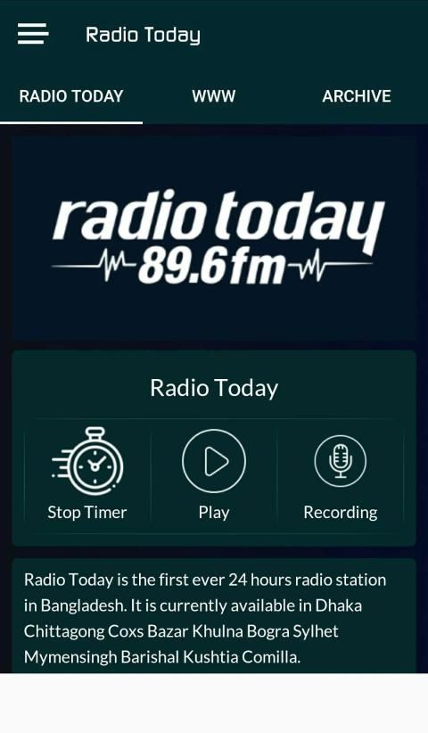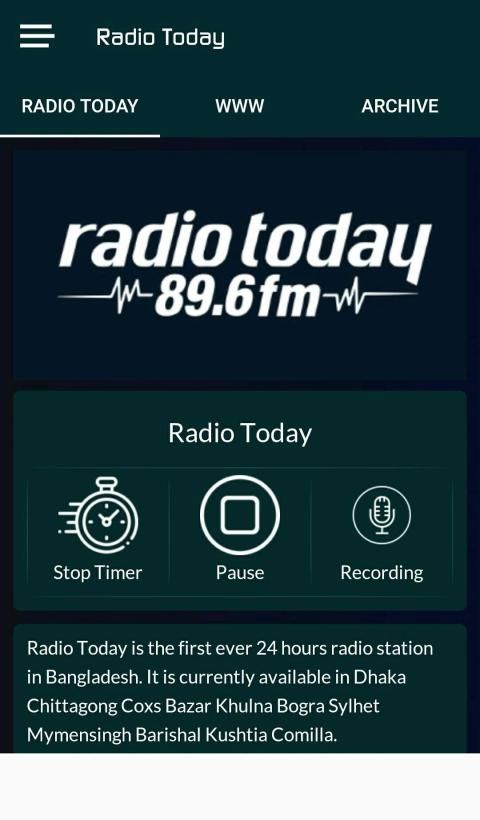 Radio Today FM 89.6 is the first ever 24 hour radio station in Bangladesh. It started airing at October 15, 2006, though it started journey at May 2006. It is currently available in Dhaka, Chittagong, Cox's Bazar, Khulna, Barisal, Mymensingh, Bogra and Sylhet.