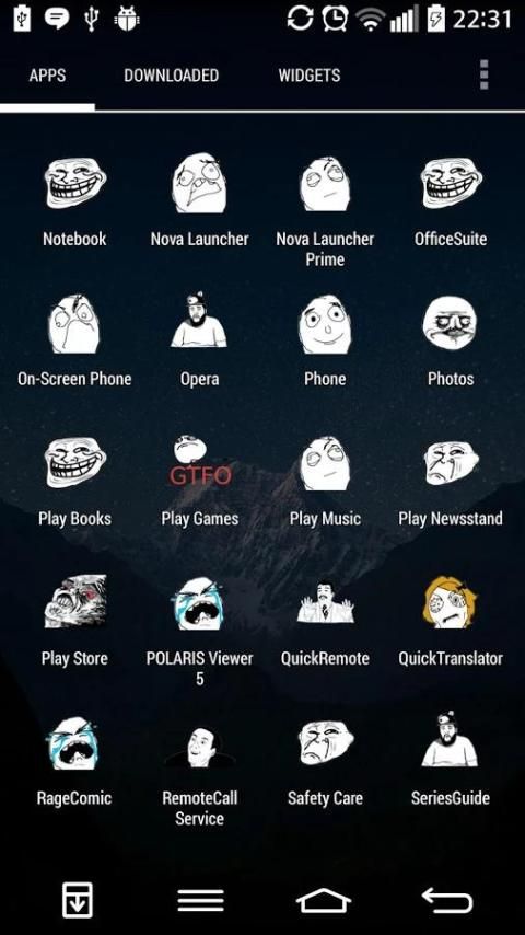 Paket ini memiliki 81 berbeda ragefaces terkenal dari komik kemarahan populer secara acak menggantikan ikon Anda. Mengubah aplikasi membosankan Anda untuk meme;)