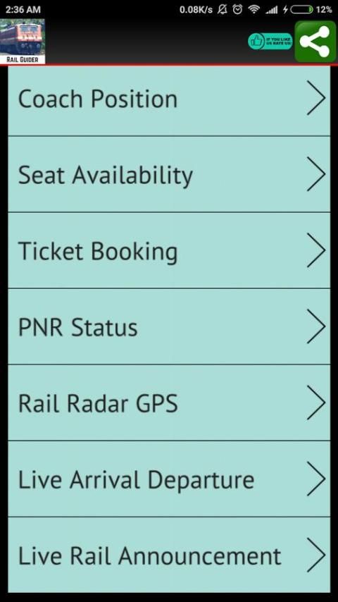 Aplikasi Rail India memiliki 1) Status PNR dan tracker 2) Cari Kereta 3) Kursi Ketersediaan 4) Jadwal Kereta Api 5) Kereta Status Live 6) Kedatangan Keberangkatan 7) informasi Offline untuk Rute Kereta Api 8) Pilihan Mudah untuk menyimpan informasi seperti PNR, Jadwal Kereta Api dan berbagi dengan teman-teman Anda melalui SMS, Email dll 9) Lihat rute di google peta 10) Kursi / Berth peta