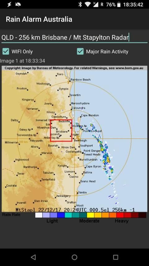 Rain Alarm Australia berjalan di latar belakang dan secara otomatis mendownload gambar radar hujan terbaru (10 gambar radar hujan per jam disediakan oleh Biro Meteorologi Australia).
