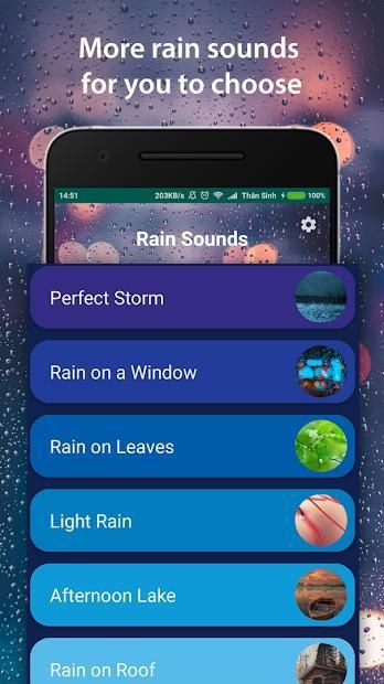 You are tired after a long day of work. Want to rest, relax body, mind. Rain Sound App will help you. Ideal for relaxing or falling asleep like heavy rain, light rain, surfing waves, etc. You will love this app, whether you Would like a thunderstorm, light rain or quiet beach or not. Also you can customize the sound to your liking, the background sound as birds singing, sound of the instrument (guitar, piano...), ...