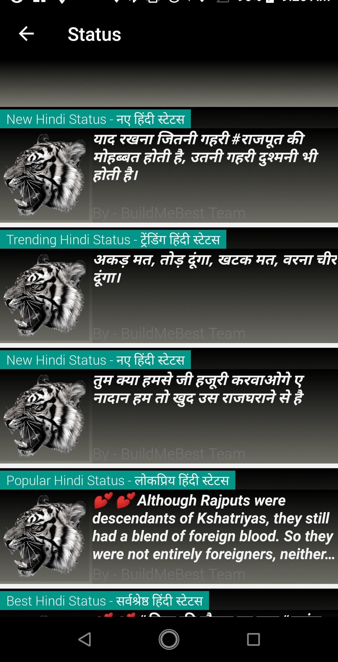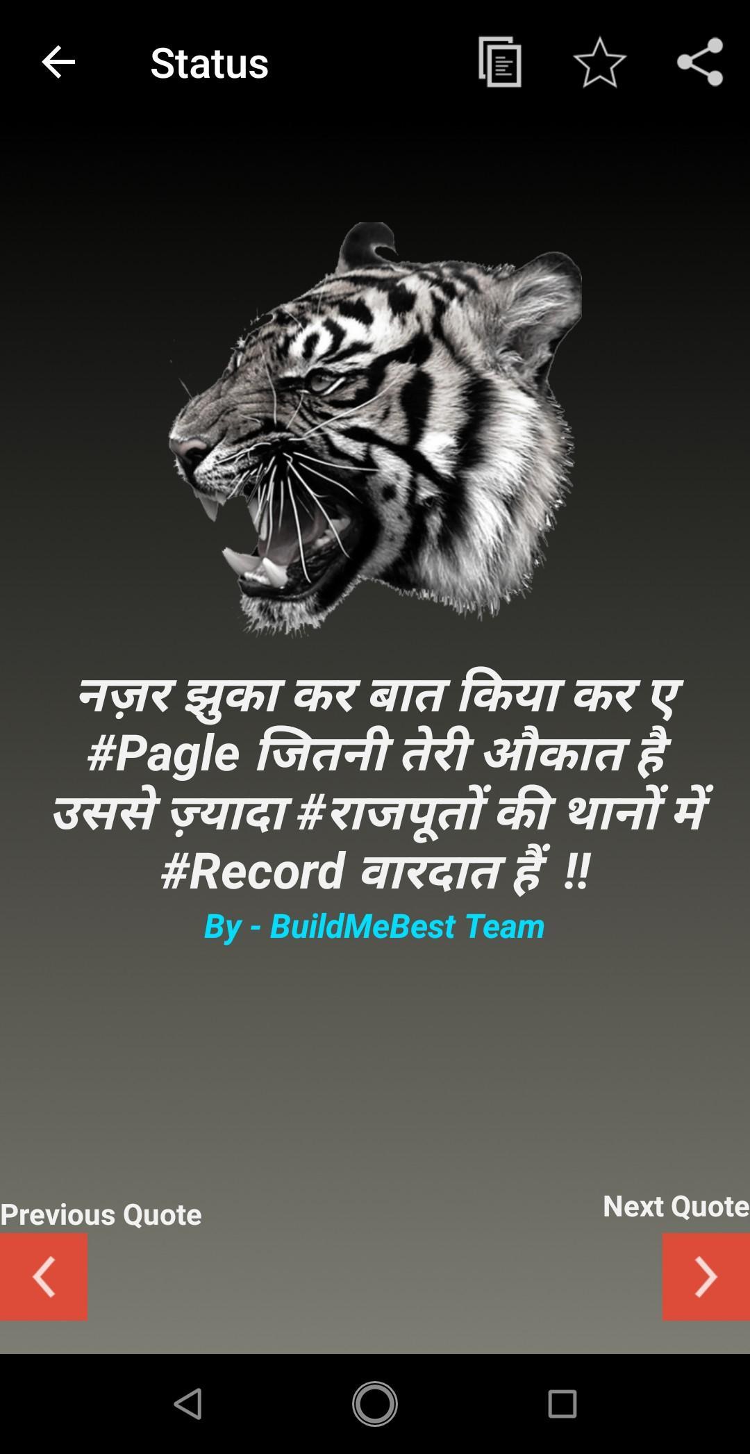 Rajputana status / Rajput status app will provide you with the best collection of Rajput status and quotes in Hindi which are related to attitude, form, thakur, akad, dadagiri and royal in nature. You can view and share this Rajputana status directly from this app and share it on any social media.