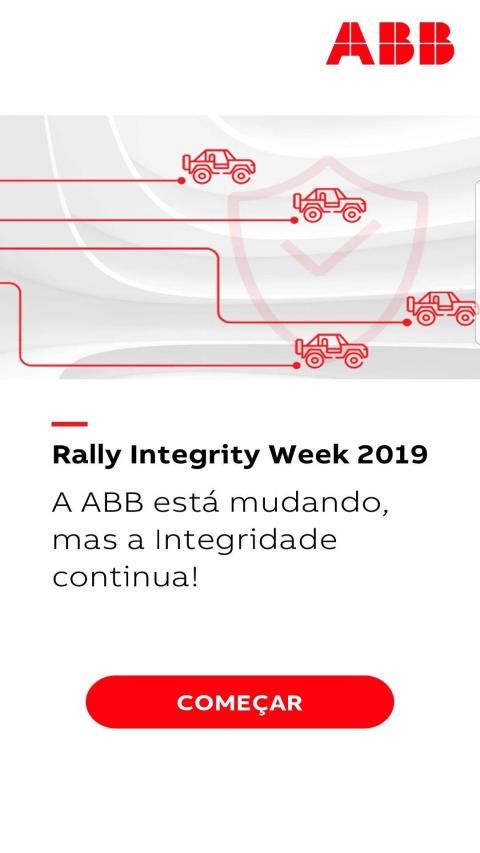 O aplicativo Rally Integrity Week ABB é um GAME/QUIZ que convida todos os colaboradores, clientes e parceiros de negócios da ABB a capturarem, por meio da solução RA – Realidade Aumentada, Placas Orientativas (disponíveis em www.integrityweek.com.br), responderem às questões sobre o tema integridade e participarem do Rally da Integridade.