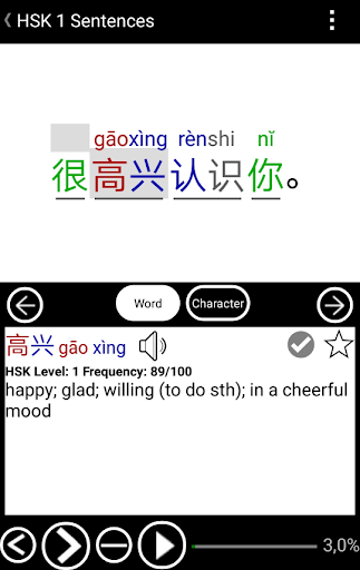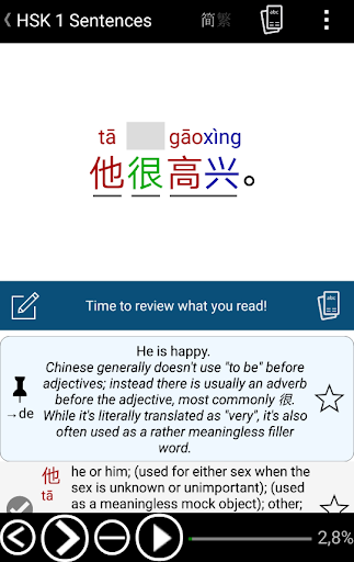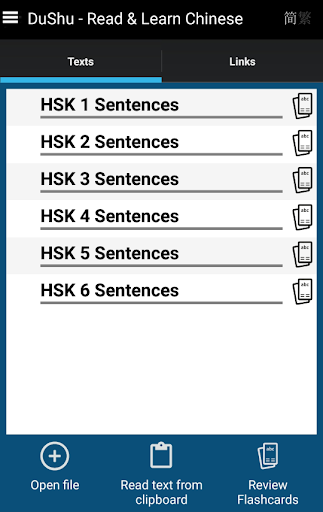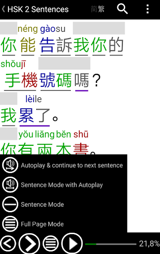 Anda dapat membaca kalimat berdasarkan kalimat, dengan daftar kosakata di bawah teks, atau teks Cina hanya dengan kosakata pada halaman terpisah. Daftar kosakata hanya menunjukkan vocab yang relevan sesuai dengan tingkat keahlian Anda. Kata-kata yang sudah Anda ketahui dapat dihapus dari daftar, aplikasi ini juga melacak kata-kata Anda yang dikenal dan tidak akan menunjukkan kata-kata yang dikenal dalam daftar vocab lagi.