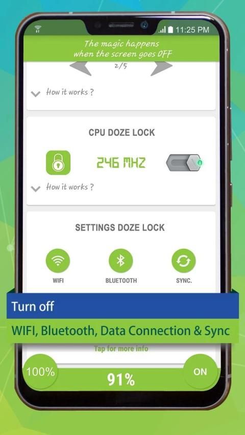 Pengaturan seperti Bluetooth, WIFI, dan Sinkronisasi menggunakan baterai dalam jumlah cukup. Doze memberi Anda kekuatan untuk mematikan pengaturan ini, yang memastikan lebih banyak daya di ponsel cerdas Anda.