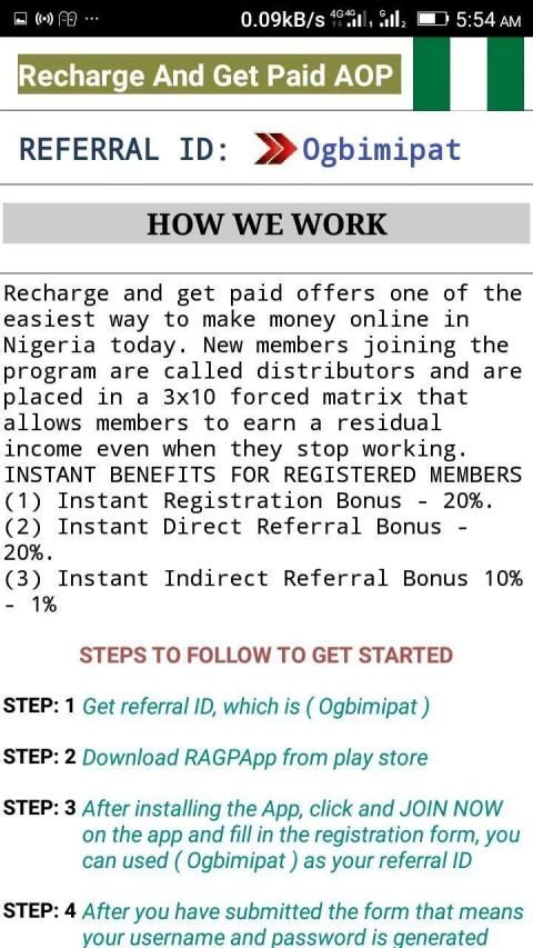 Ini adalah bisnis yang berpotensi membuat Anda mendapatkan penghasilan pasif antara ₦ 1000 hingga ₦ 10.000 per hari. Ia menawarkan salah satu cara termudah untuk menghasilkan uang secara online di Nigeria hari ini. Anggota baru yang bergabung dengan program ini disebut distributor dan ditempatkan dalam matriks 3x10 paksa yang memungkinkan anggota untuk mendapatkan sisa pendapatan bahkan ketika mereka berhenti bekerja.