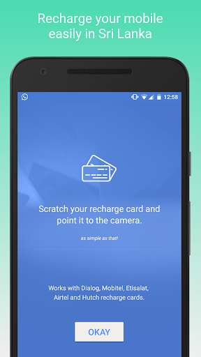 Recharge cards are not annoying anymore. Recharger is the quickest way to recharge your mobile account when you have a recharge card in your hand. It can scan and read any Dialog, Mobitel, Etisalat, Hutch or Airtel recharge card so you don’t have to type the PIN number manually.
