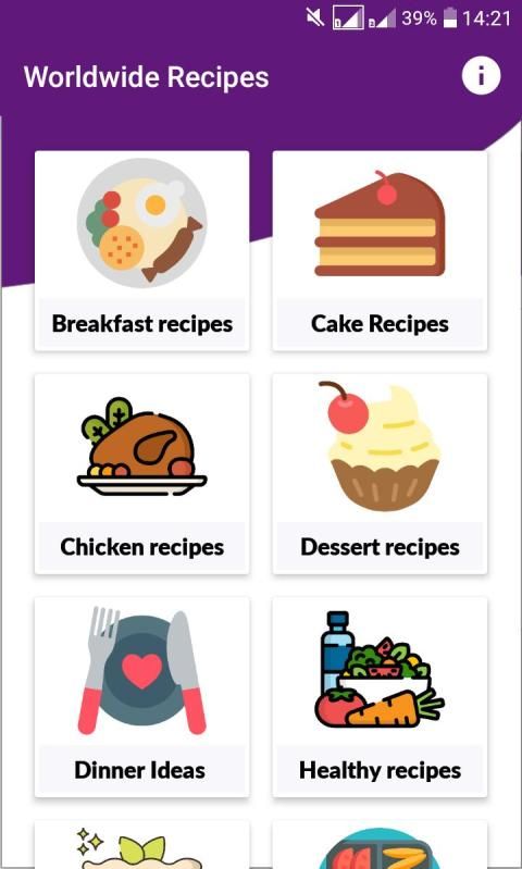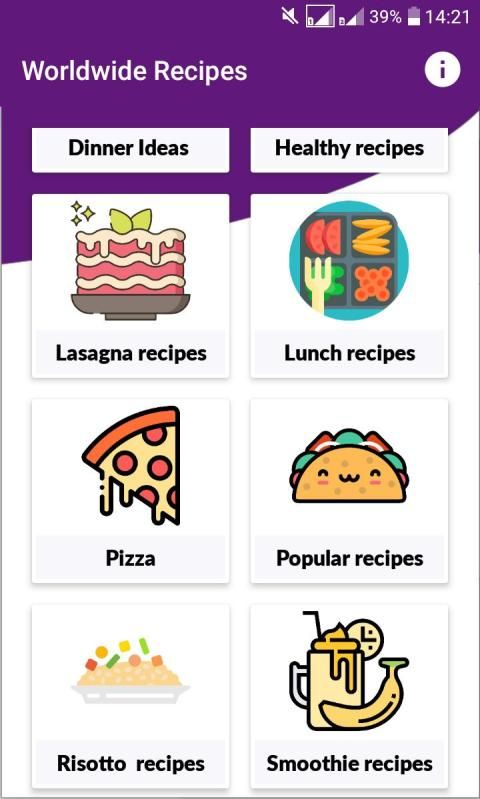 Recipy is the easiest way to get the recipes you need, just open the application and you will find the most popular food categories: