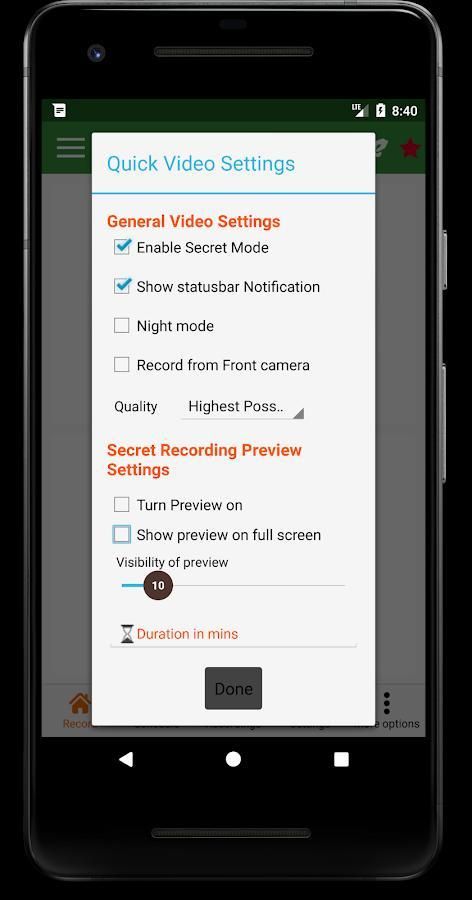 Semua rekaman tersembunyi dari galeri normal, Anda dapat menelusuri semua dari aplikasi dan juga dapat menaruh kunci nomor untuk mengamankan dan aman dari penyusup lain dan penggunaan yang tidak diinginkan.