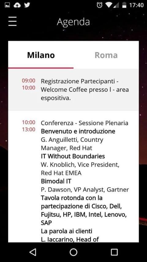 Red Hat OSD è l'app ufficiale nata dalla collaborazione tra Red Hat e Open Reply dedicata all'evento Italiano "Open Source Day 2015" che si terrà a Milano il 03/11/2015 e a Roma il 05/11/2015.