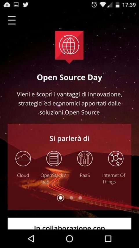 Tramite questa applicazione sarà possibile reperire tutte l'informazioni riguardanti l'OSD: Mappa dell'evento, Agenda, Argomenti di interesse e condivisione tramite Social Networks.