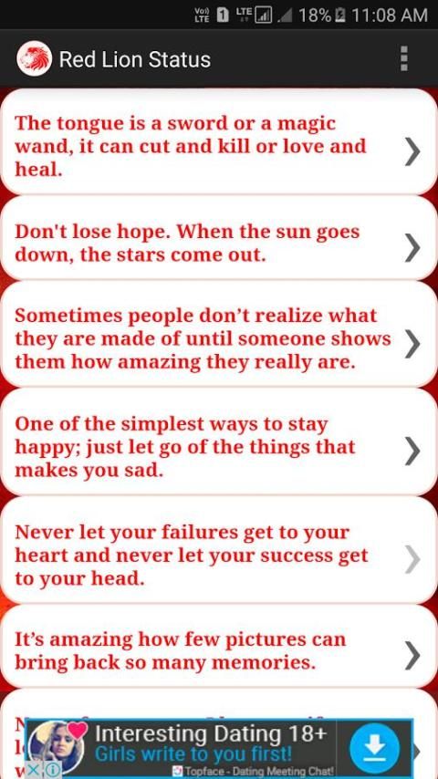 Red Lion Status benar-benar sulit untuk menemukan sebuah status yang tidak digunakan oleh siapa saja dan yang asli. Jadi di sini kita telah mengumpulkan beberapa yang terbaik, daftar terbaru dan tersentuh untuk Anda. Yang termasuk Status Hindi, kutipan, Shayri dan banyak lagi. aplikasi ini diperbarui secara berkala sehingga menantikan untuk tambahan baru ...
