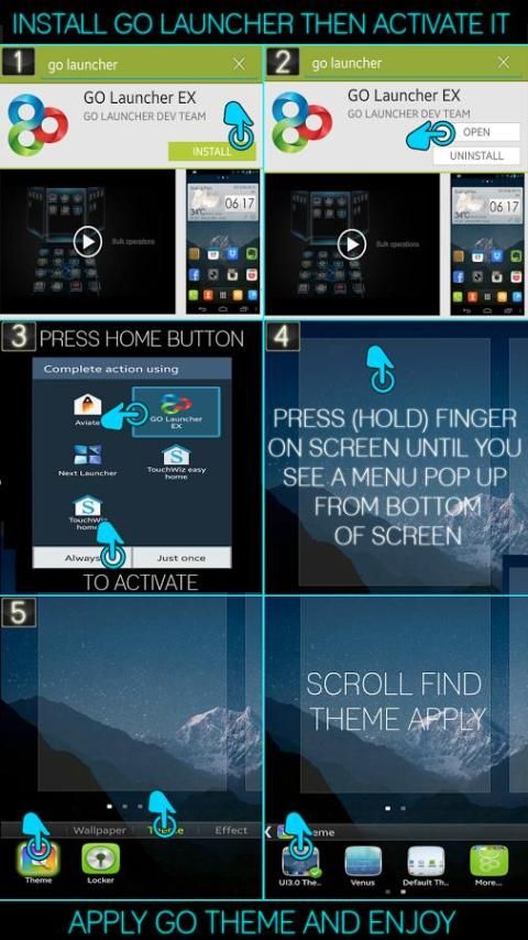 Terbuka "Play Store" app> Search for "Go Launcher> Install> Open Go Launcher> Hit" Home "Tombol>" tindakan lengkap menggunakan "Klik Go Launcher (Selalu)