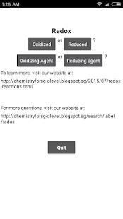 Dalam aplikasi Kimia kuis pada reaksi redoks, Anda akan diminta untuk menentukan apakah zat dioksidasi atau berkurang; apakah itu agen pengoksidasi atau agen mengurangi. Pertanyaan-pertanyaan ini didasarkan pada tingkat O kimia silabus pada bab tentang reaksi redoks.