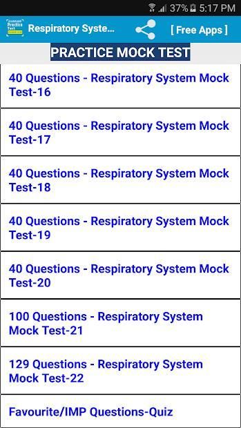Respiratory System Quiz Questions free app help to prepare Respiratory System Exam. In this Respiratory System Quiz Questions and Answers free App having more than 1000+ Respiratory System quiz questions for best Respiratory System Exam Preparation.