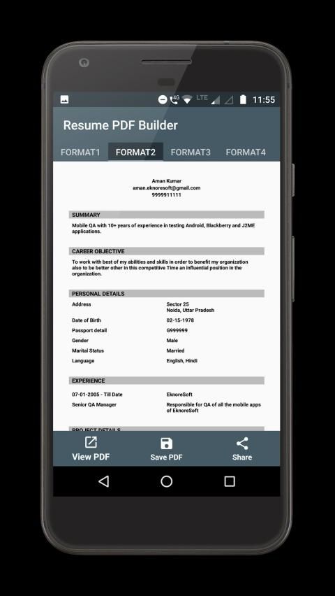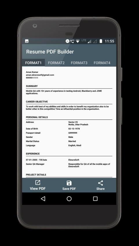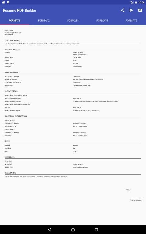 Resume Maker app provides you ready made resume templates or samples. To create resume you do not need to worry about what format, what information to put etc, just enter the information and forget about the formatting, we will take care of formatting for you. This Resume editor allows you to choose resume from among 15 formats. All the formats are completely free.