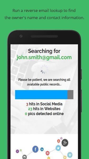 Email Penelusuran tidak hanya membantu Anda menemukan pemilik alamat email yang tidak dikenal, tetapi juga menghubungkan Anda ke informasi tambahan tentang pemilik itu. Dapatkan informasi tentang hampir semua alamat email dengan aplikasi email Reverse Lookup oleh hanya memasukkan email orang.